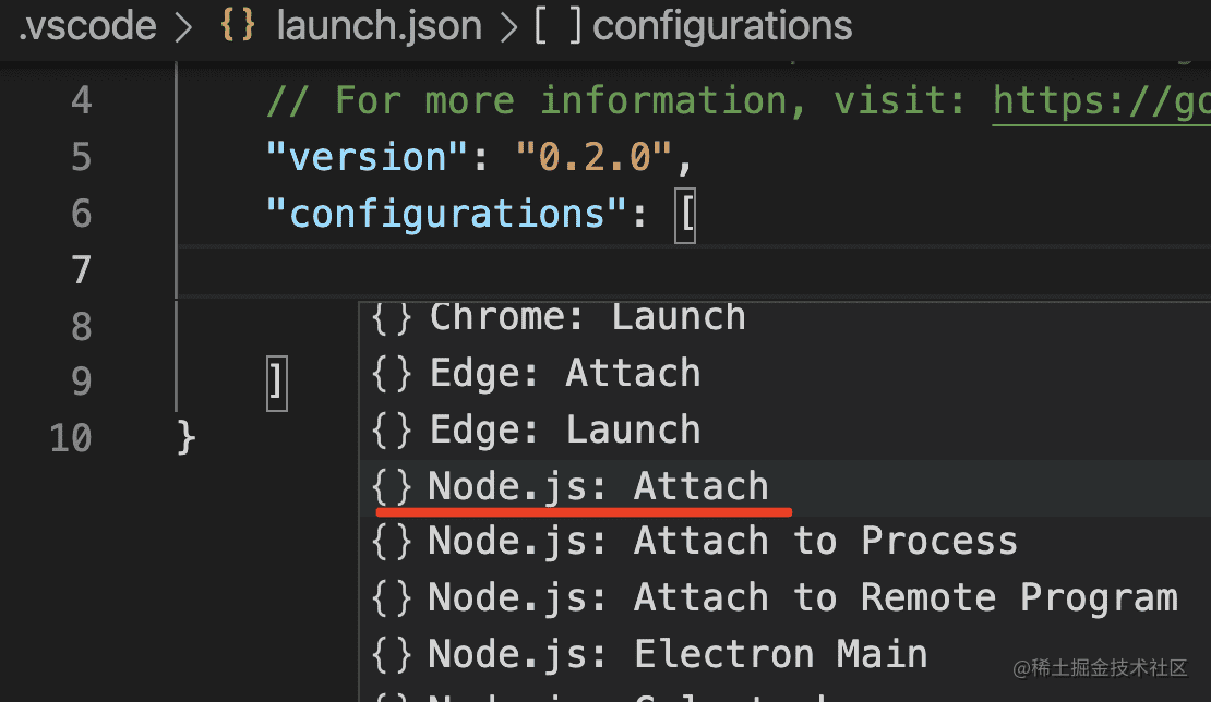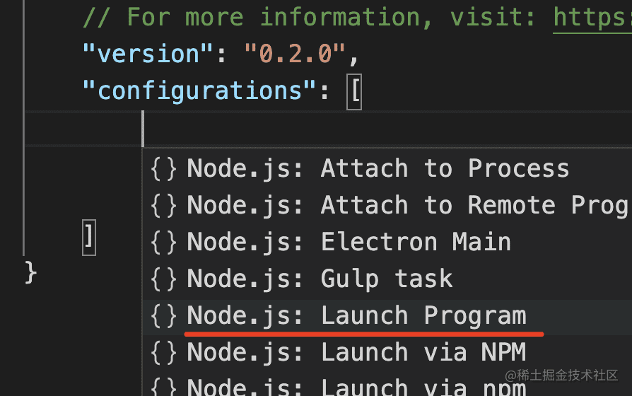 除了自己启动 node 调试服务,然后手动 attach 外,还可以选择 launch 类型的调试配置,自动进行这个过程。