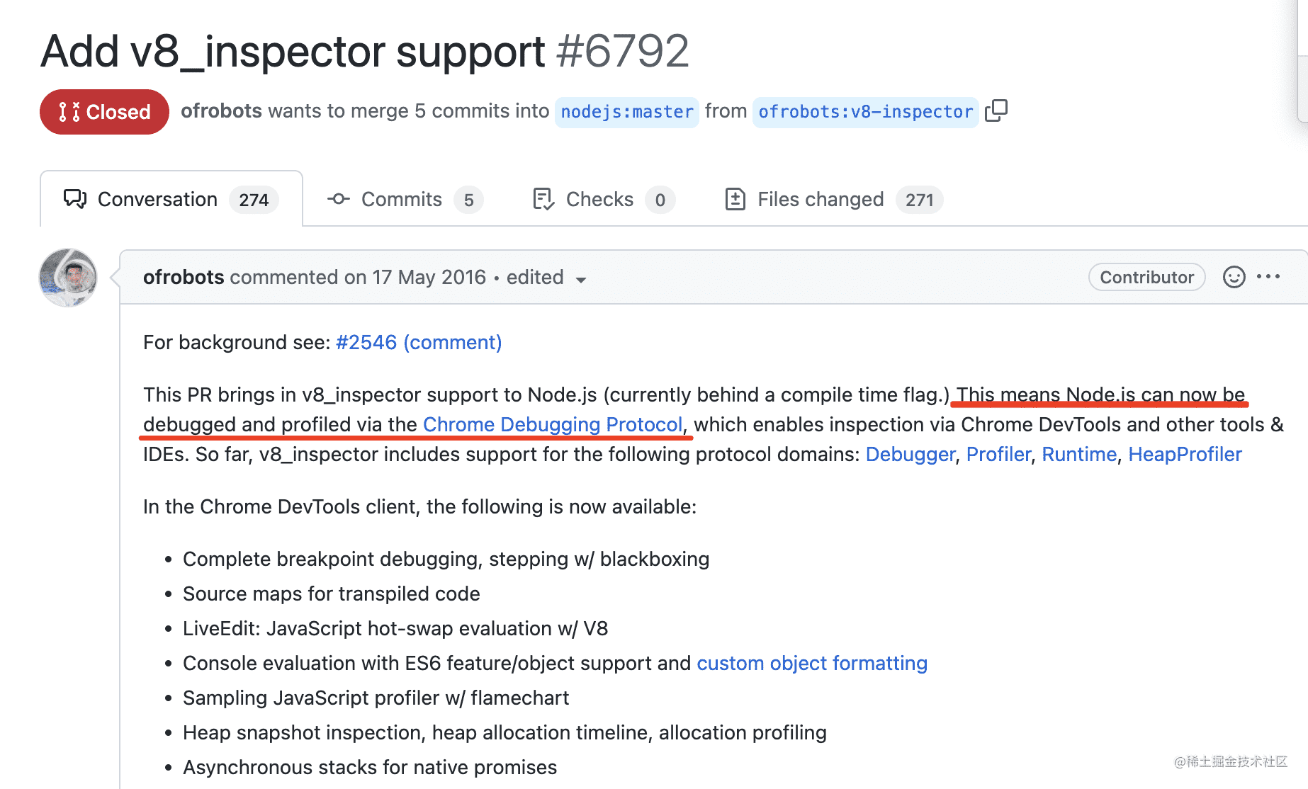 当时就有了这样一个 pr,把 v8 inspector 集成到 Node.js 中: