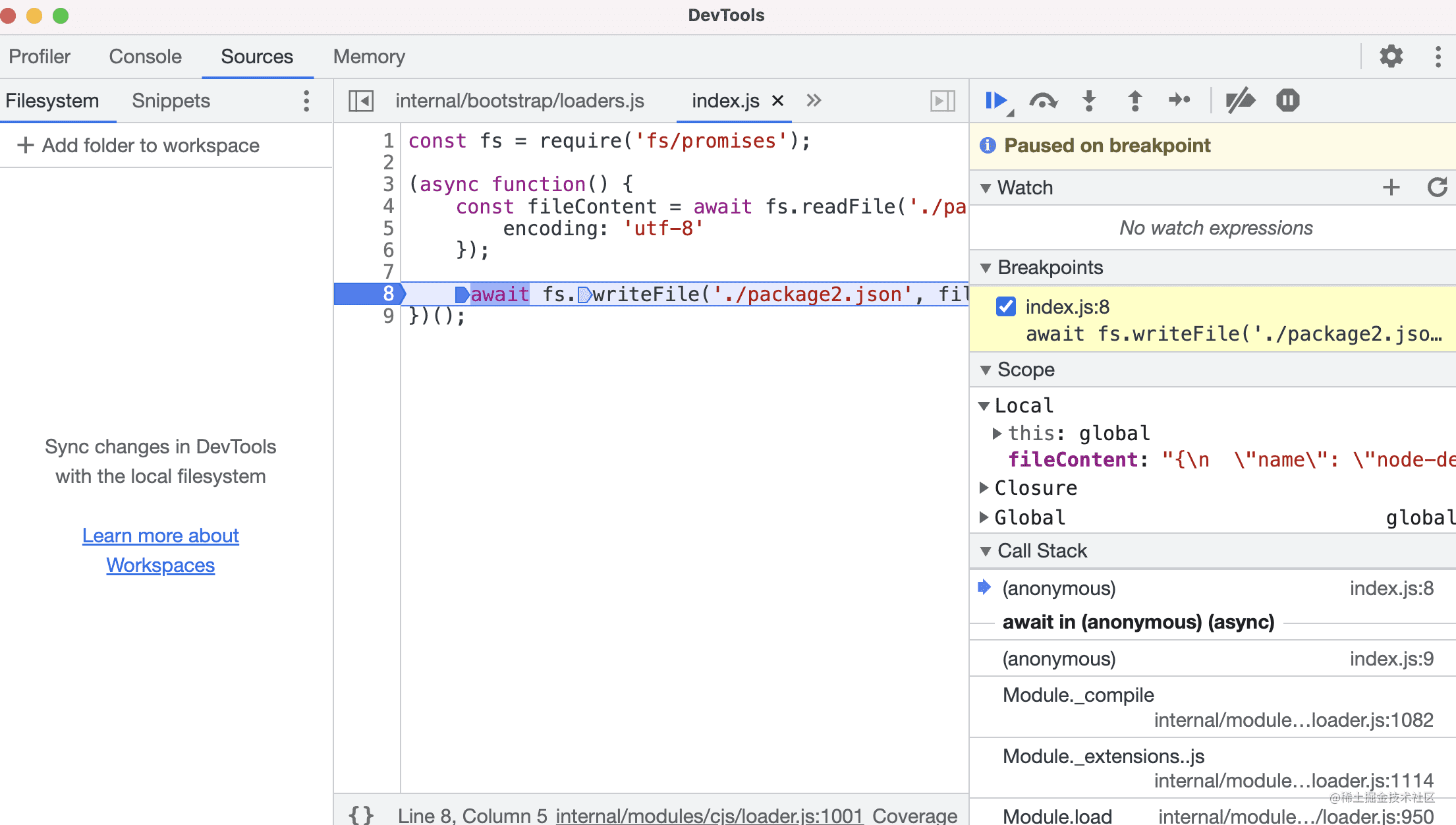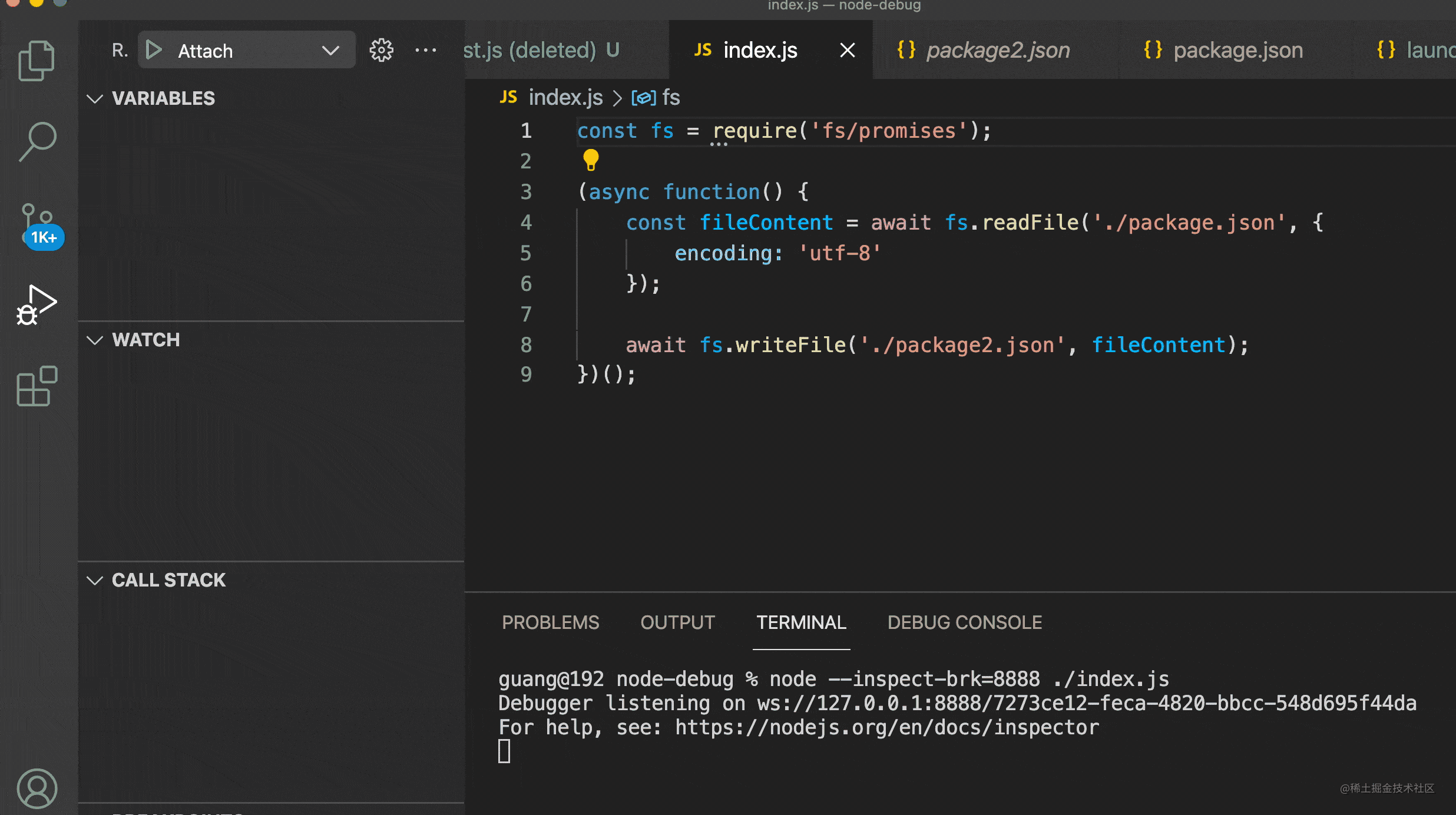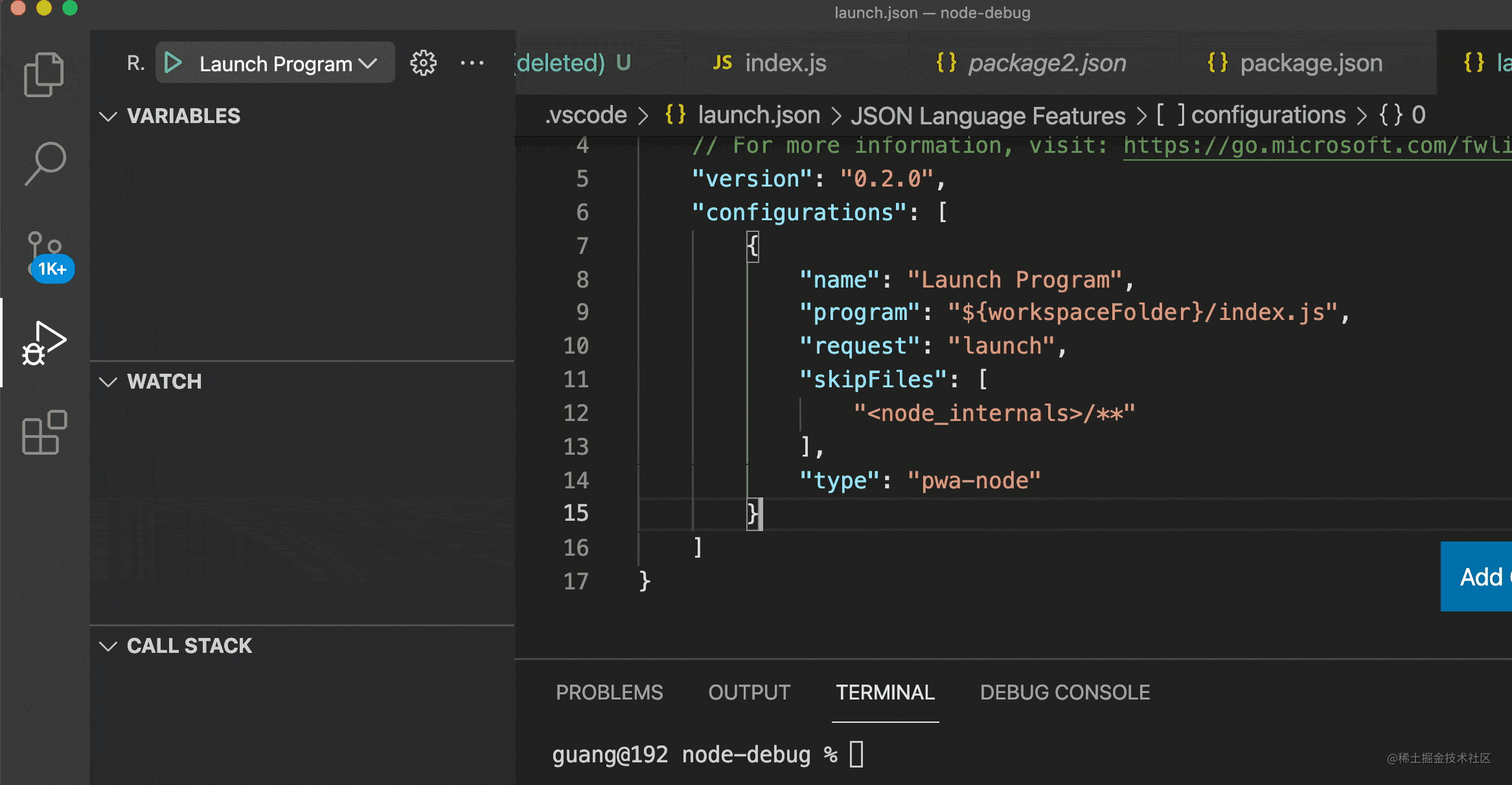 当然,这里只是说 Chrome DevTools 调试 Node.js,在 VSCode 里调试 Node.js 的话还要做一些额外的处理: