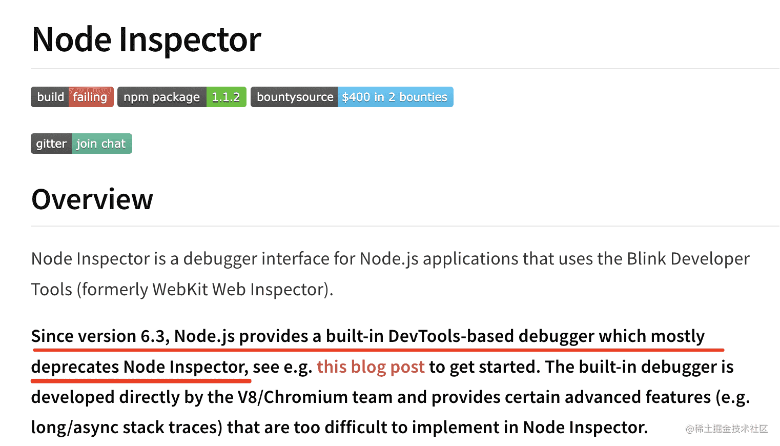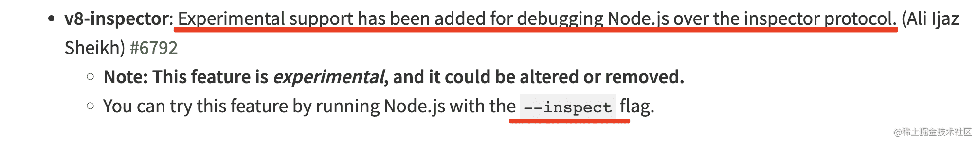 并且在成熟之后去掉了对 v8 debug protocol 的支持,也就是废弃了 node debug 命令,改为了 node inspect。