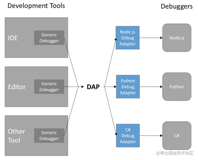 这就是 DAP 协议,debugger adpater protocol。