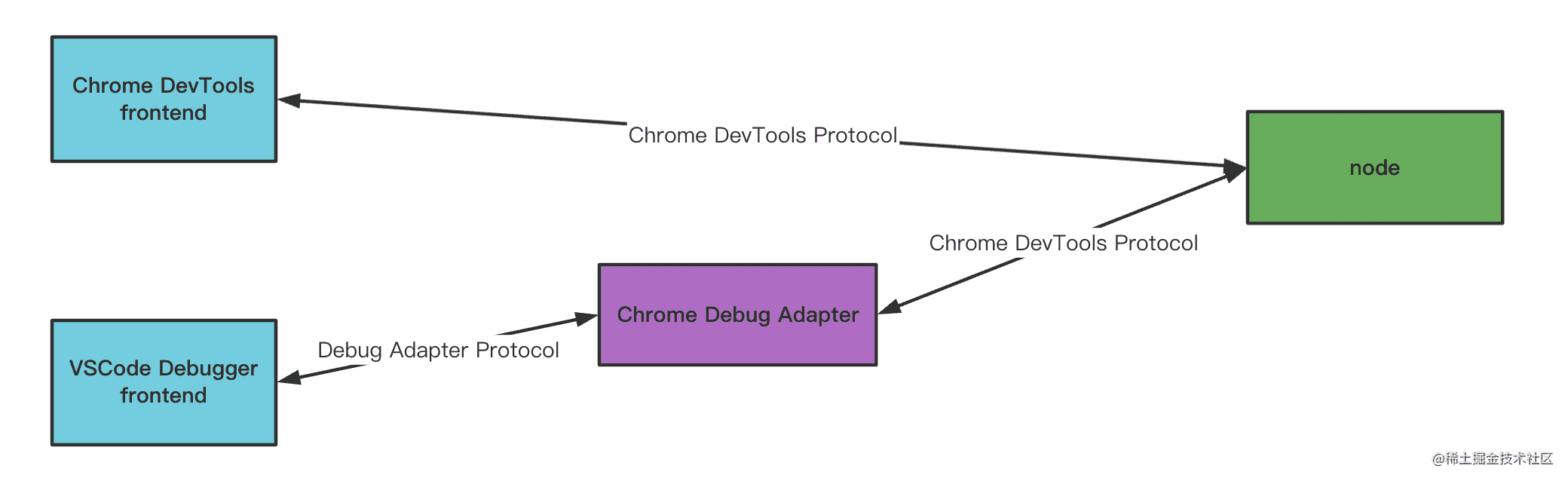 node 调试的协议也是用的 Chrome DevTools Protocol,就是为了能够复用 Chrome DevTools 的 UI 的,中间还有一段历史是用 node inspector 做中转。