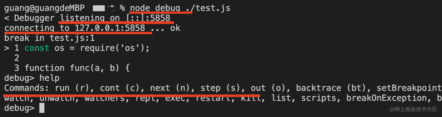 通过 node debug 来跑 js 文件,会在首行断住: