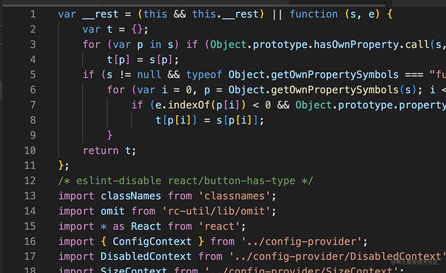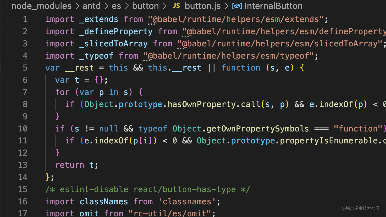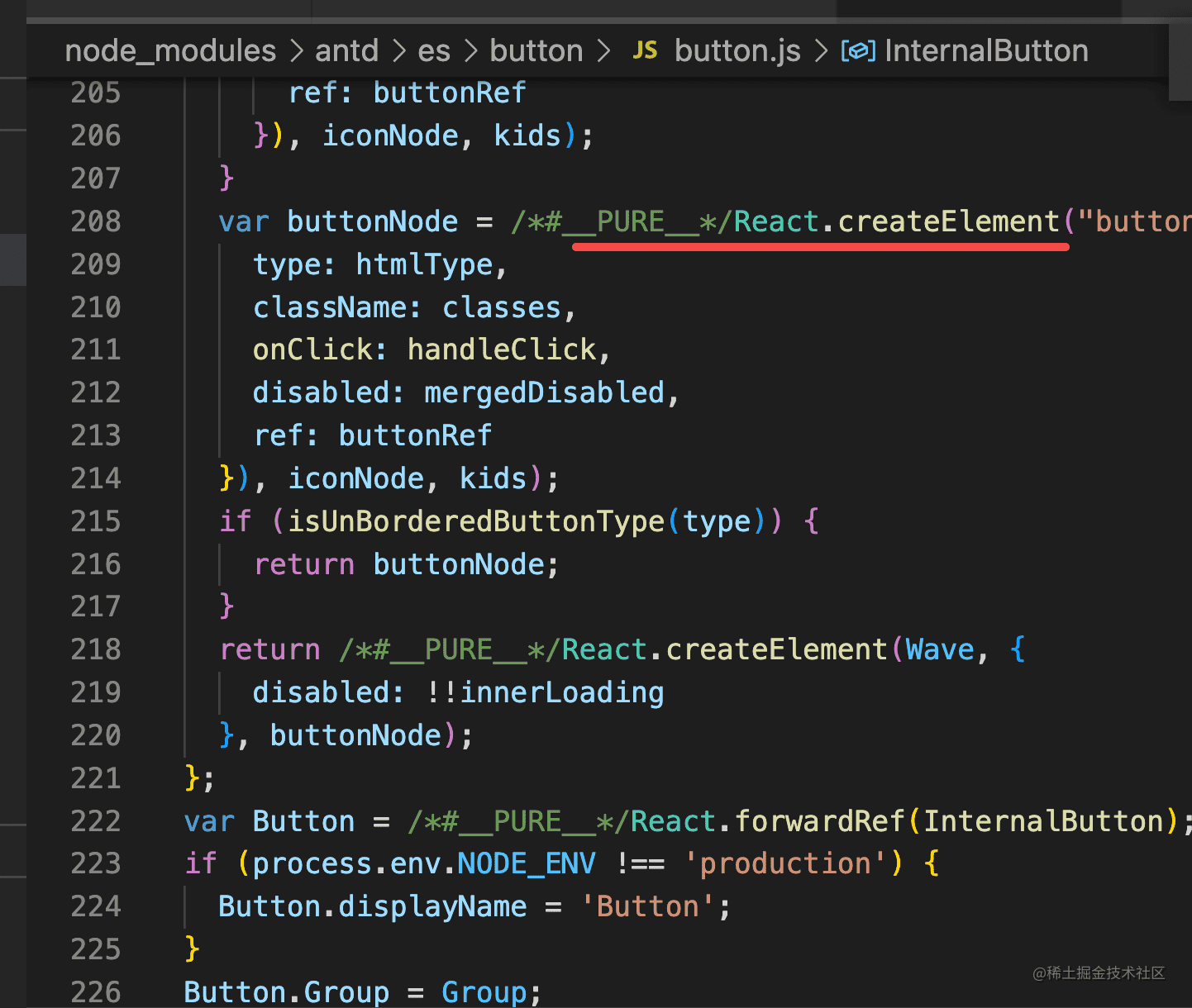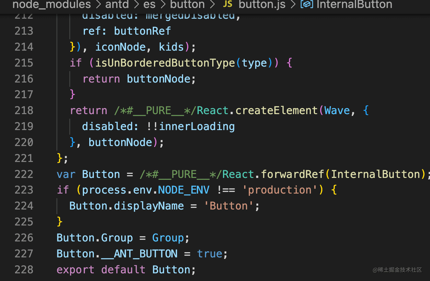 你会发现这确实是 Button 组件的源码,但却是被编译后的,比如 jsx 都被编译成了 React.createElement: