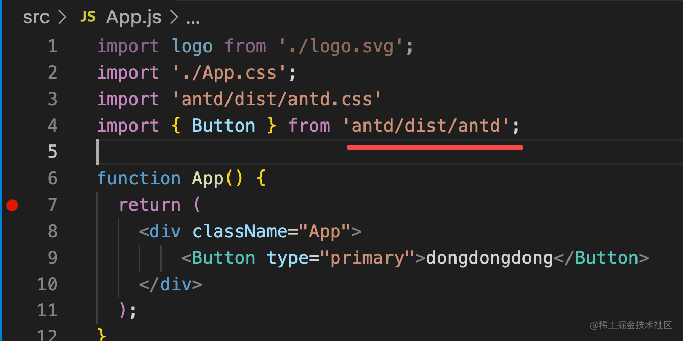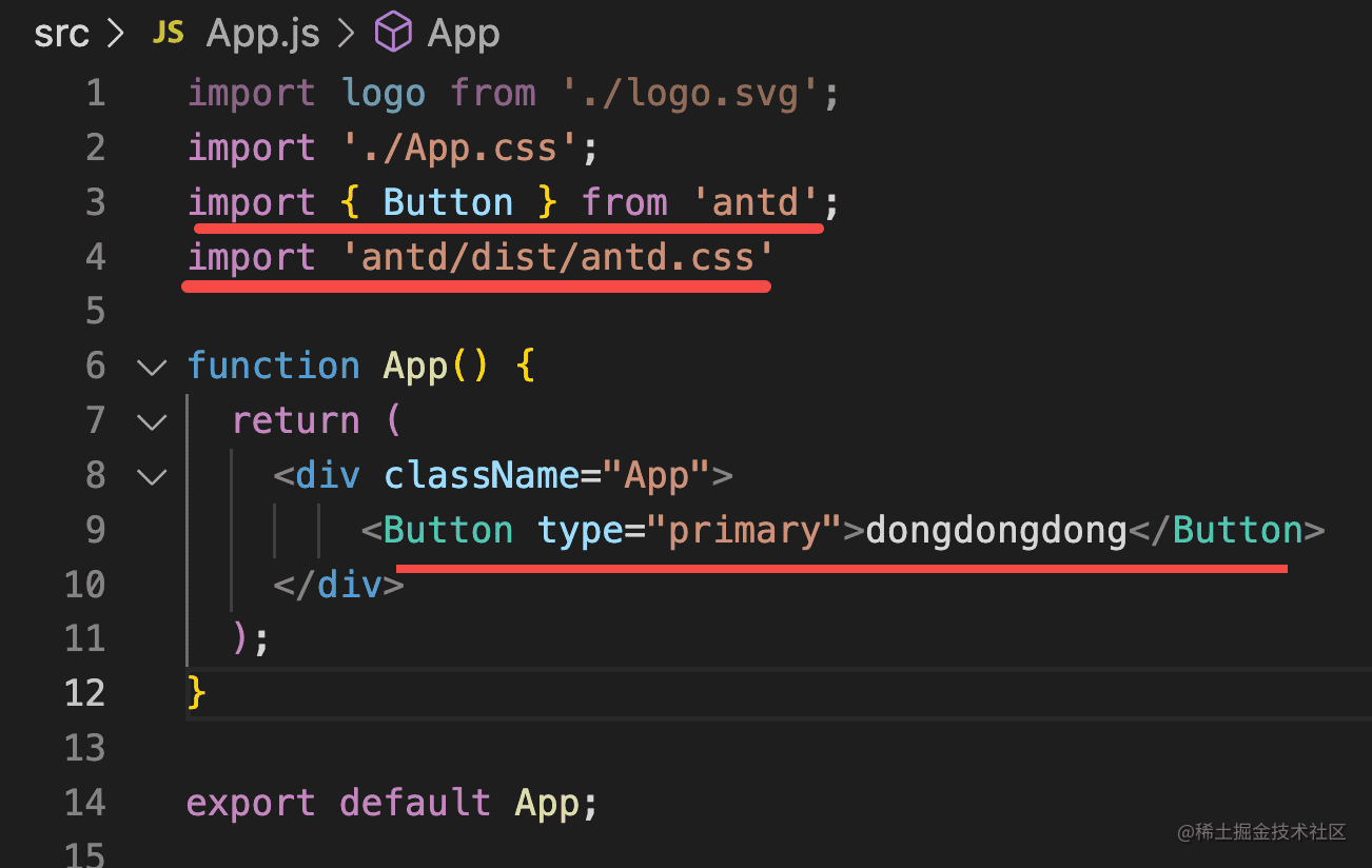 然后我们安装 antd,在入口组件里引入样式和 Button 组件: