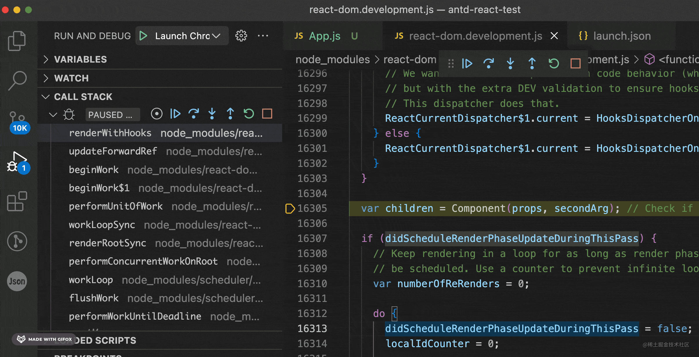 可以看到调用栈中上一帧是 renderWithHooks,这就是 react 源码里调用函数组件的地方。