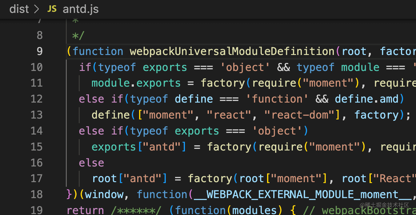 执行 npm run dist,就会构建出 dist 目录,下面是 UMD 的代码: