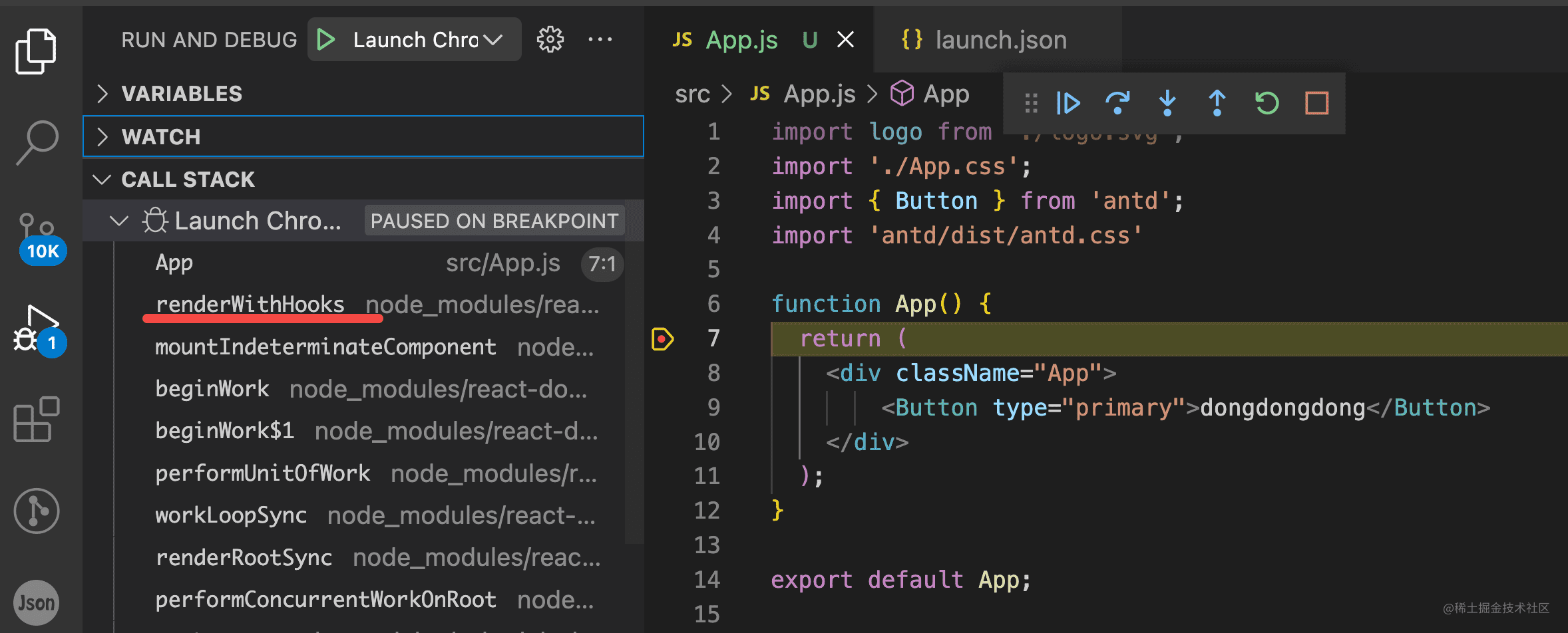 你会看到 App 组件明明也是函数组件,却没有在这里断住,而 InternalButton 在这里断住了。