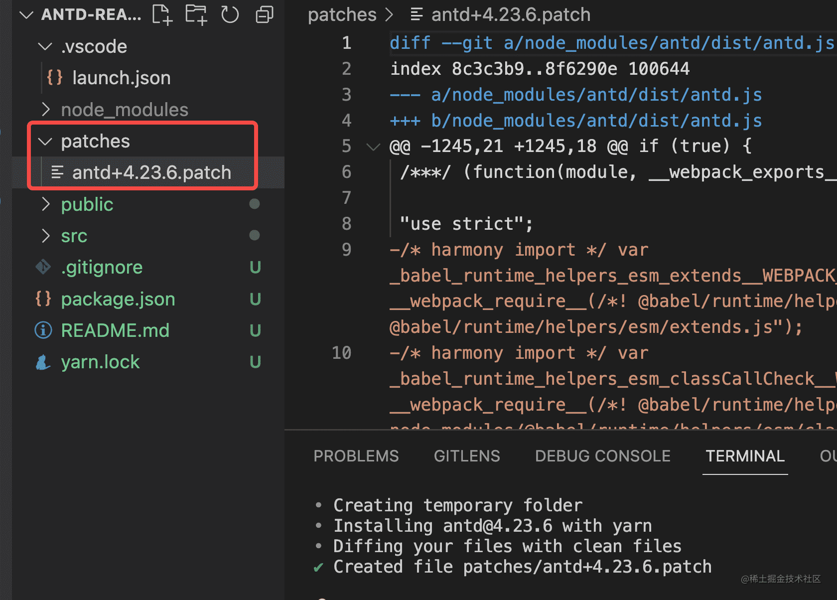 这个也不是问题,可以执行下 npx patch-package antd,会生成这样一个 patch 文件: