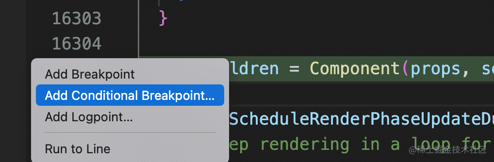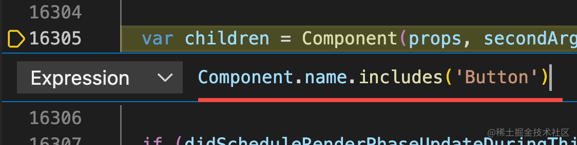 我们可以在 renderWithHooks 里调用函数组件的地方打个条件断点,在调用想调试的组件时断住,这样我们就可以 step into 到该组件定义的地方。