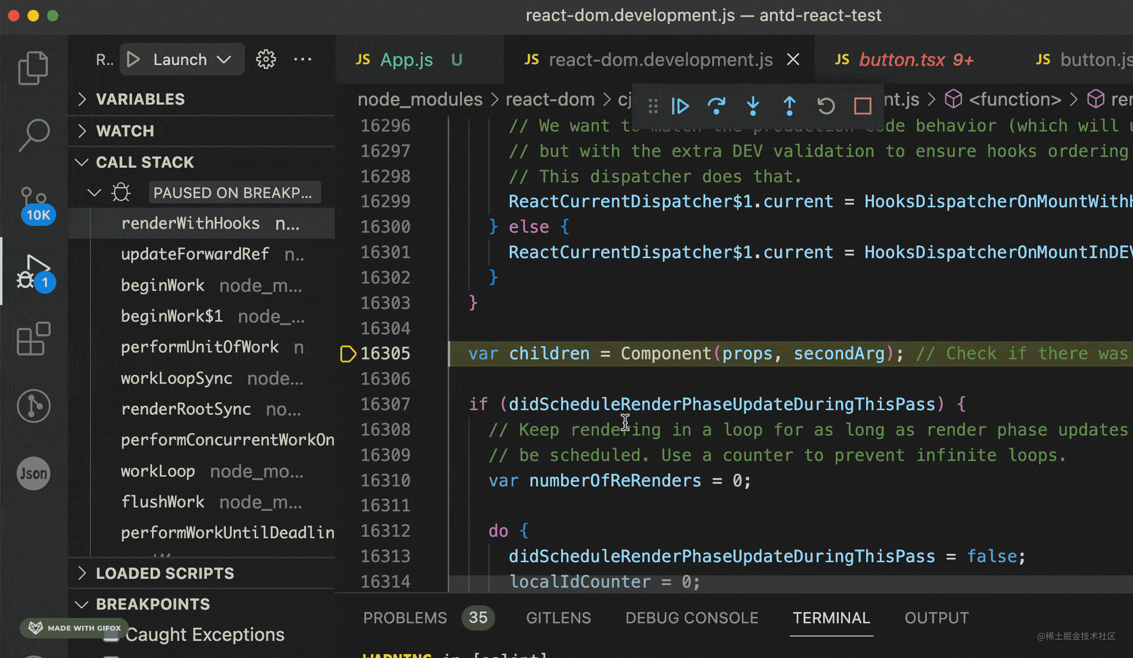 所有函数组件都是在这里被调用的,而 antd 的组件也全部是函数组件,那么我们在这里加个断点,打名字为 Button 的函数组件被调用的时候断住不就行了?
