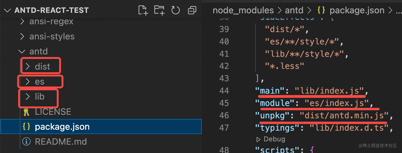去 react 项目的 node_modules 下,找到 antd 的 package.json 看一下,你会发现它有三种入口:
