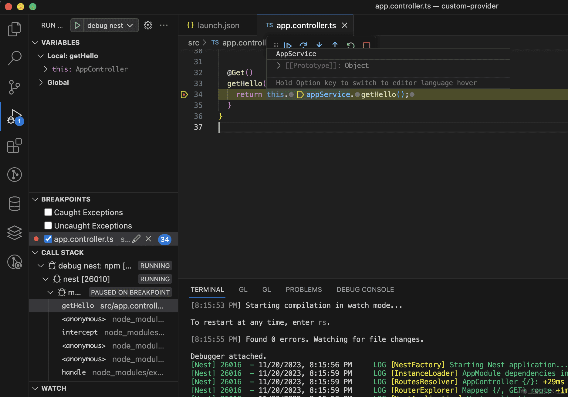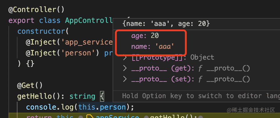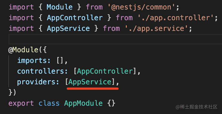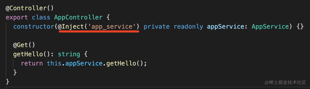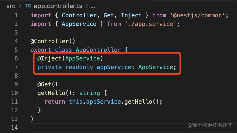 在 AppController 的构造器里参数里声明了 AppService 的依赖,就会自动注入: