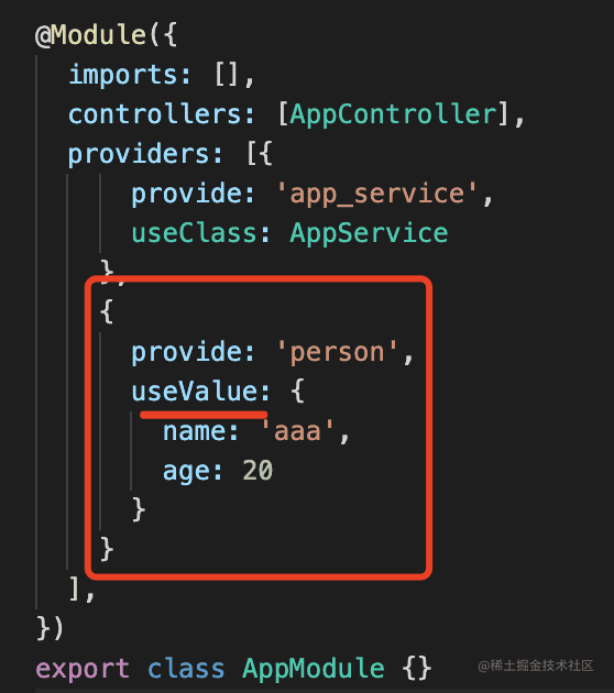 除了可以用 useClass 指定注入的 class,还可以用 useValue 直接指定注入的对象。
