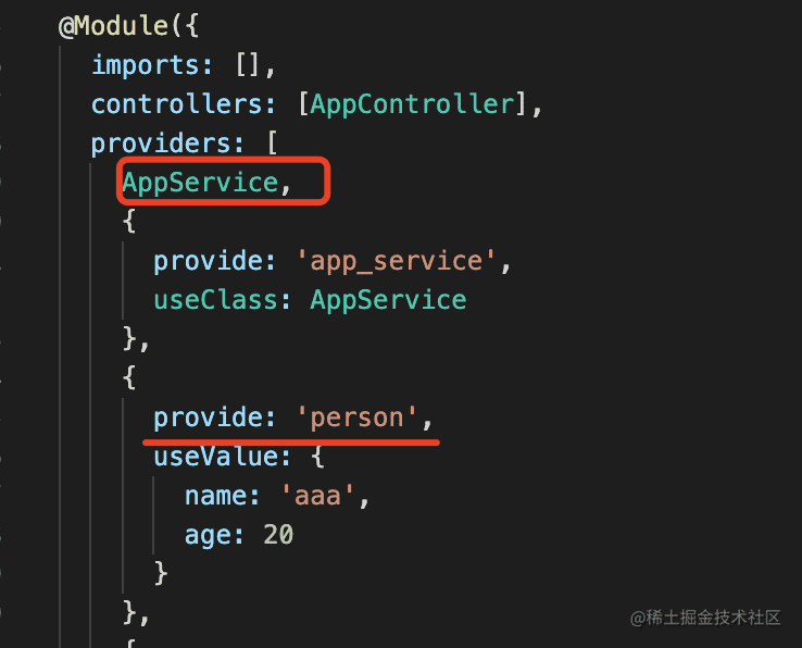一般情况下,provider 是通过 @Injectable 声明,然后在 @Module 的 providers 数组里注册的 class。