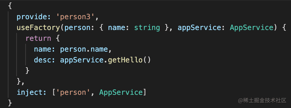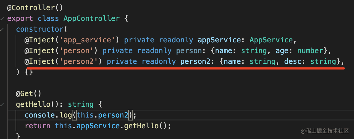 通过 inject 声明了两个 token,一个是字符串 token 的 person,一个是 class token 的 AppService。