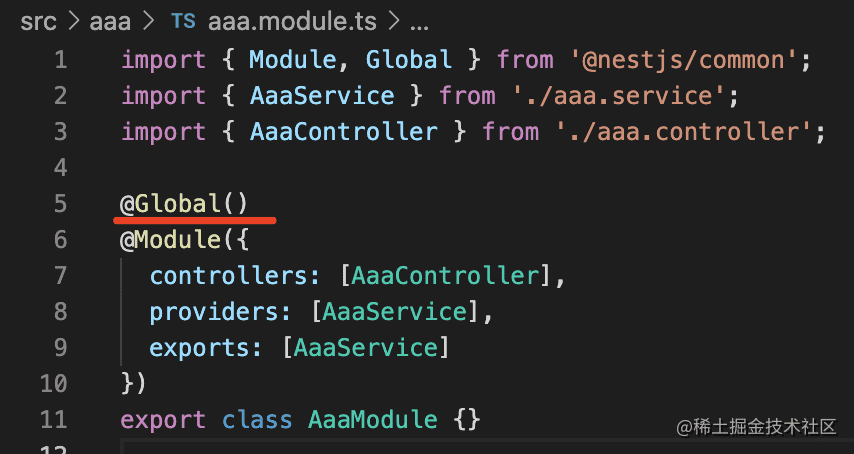 如果模块被很多地方都引用,为了方便,可以用 @Global 把它声明为全局的,这样它 exports 的 provider 就可以直接注入了: