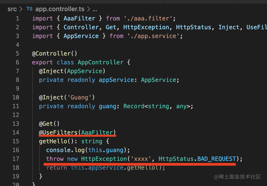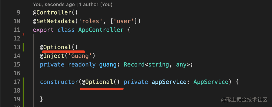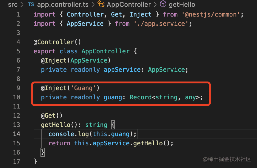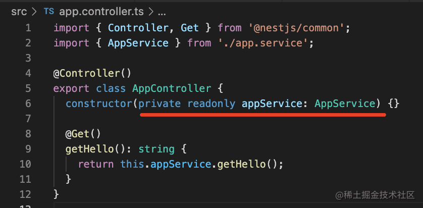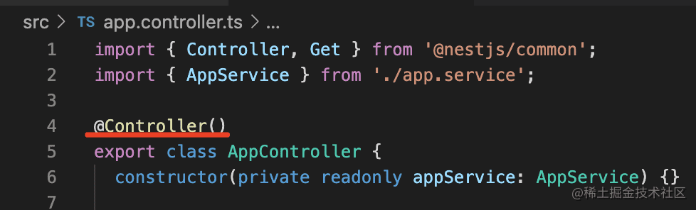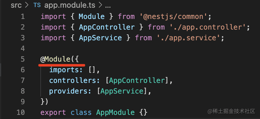 通过 @Controller、@Injectable 分别声明其中的 controller 和 provider:
