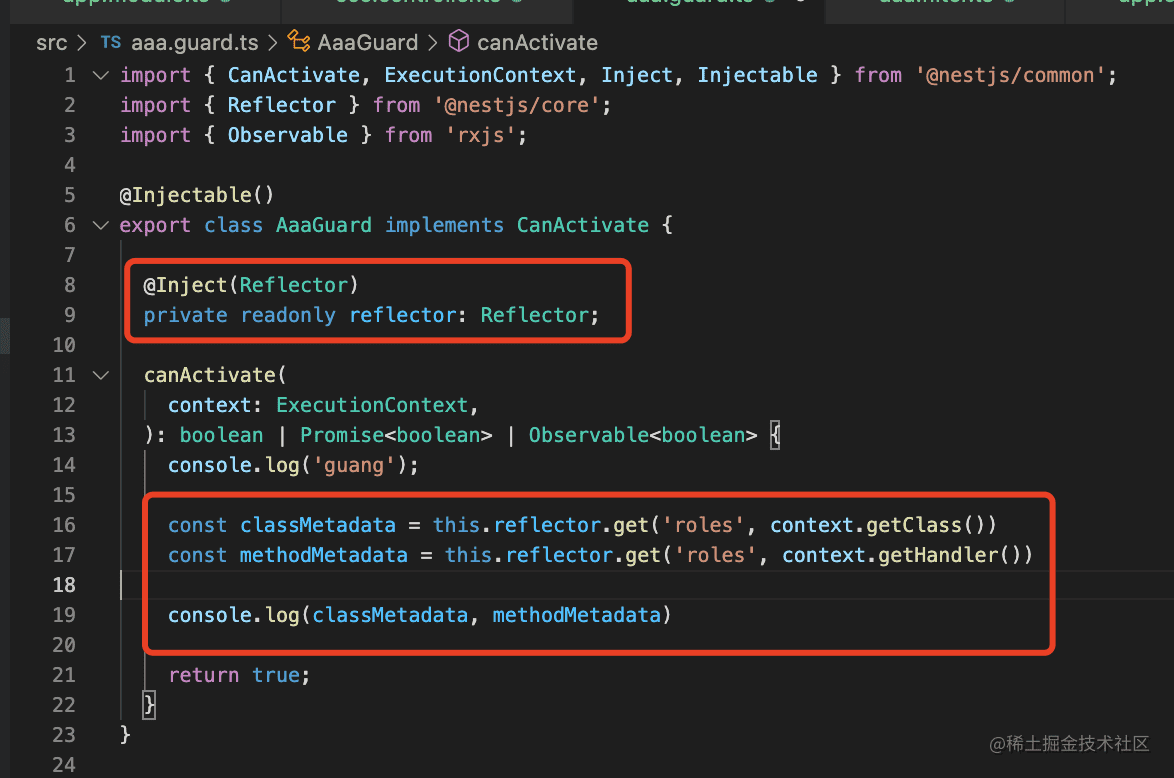 在这个例子中,@SetMetadata('roles', ['admin']) 会在 findAll 方法上设置一个名为 roles 的元数据,值为 ['admin']。你可以在守卫或其他地方通过 Reflector 来获取这个元数据。