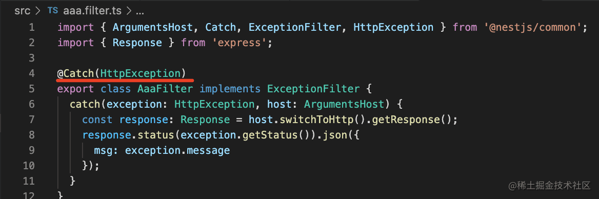filter 是处理抛出的未捕获异常的,通过 @Catch 来指定处理的异常: