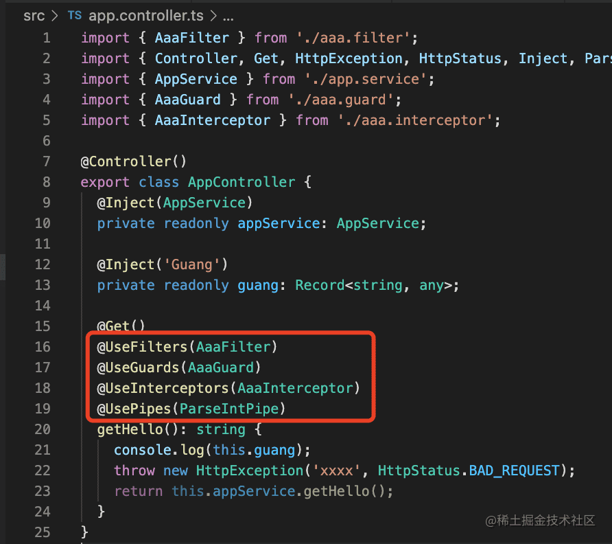 除了 filter 之外,interceptor、guard、pipe 也是这样用: