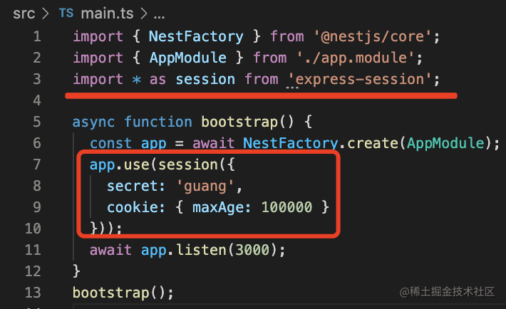 - @Session:取出 session 对象,需要启用 express-session 中间件