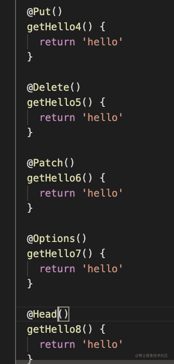 除了 @Get、@Post 外,还可以用 @Put、@Delete、@Patch、@Options、@Head 装饰器分别接受 put、delete、patch、options、head 请求: