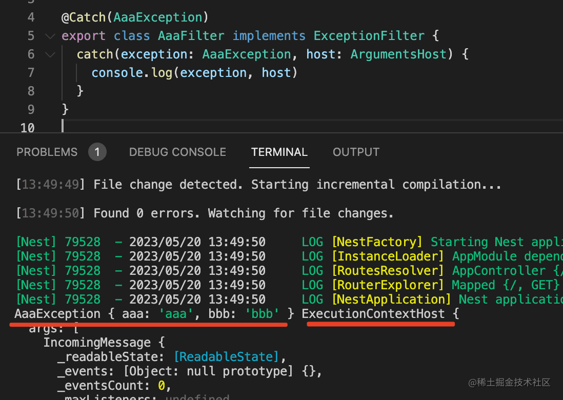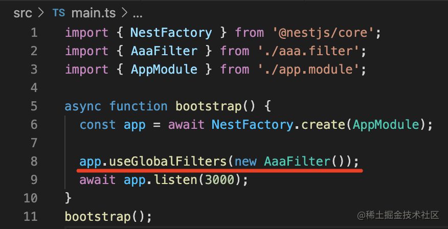 然后创建一个 filter:nest g filter aaa --flat --no-spec
