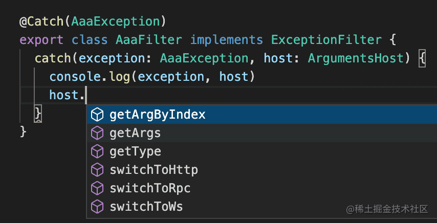 ArgumentHost 可以通过 getArgs 或者 getArgByIndex 拿到上下文参数,比如 request、response、next 等。