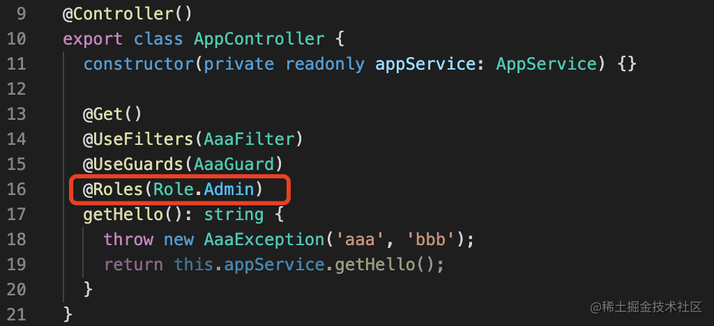 然后在 handler 上添加这个装饰器,参数为 admin,也就是给这个 handler 添加了一个 roles 为 admin 的metadata。