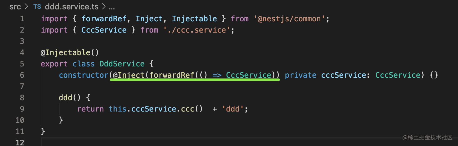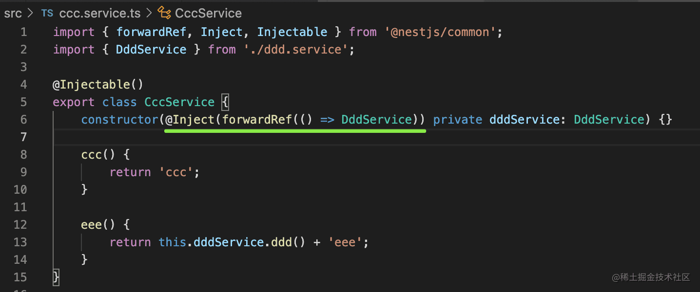 这时候就不能用默认的注入方式了,通过 @Inject 手动指定注入的 token,这里是 forwardRef 的方式注入。