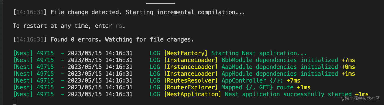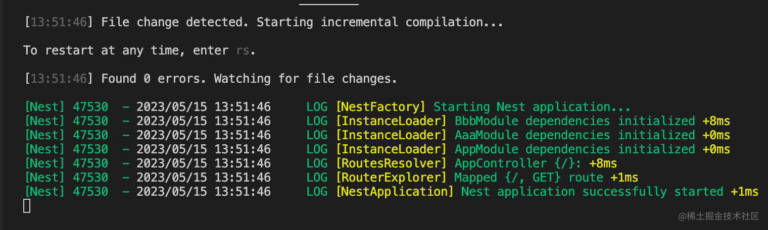 因为我们用了 nest start --watch 的方式启动的,nest 会自动重启,这时候就没有错误了:
