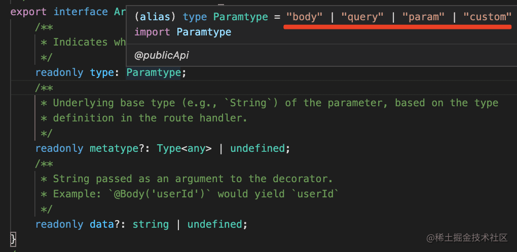type 就是 @Query、@Param、@Body 装饰器,或者自定义装饰器: