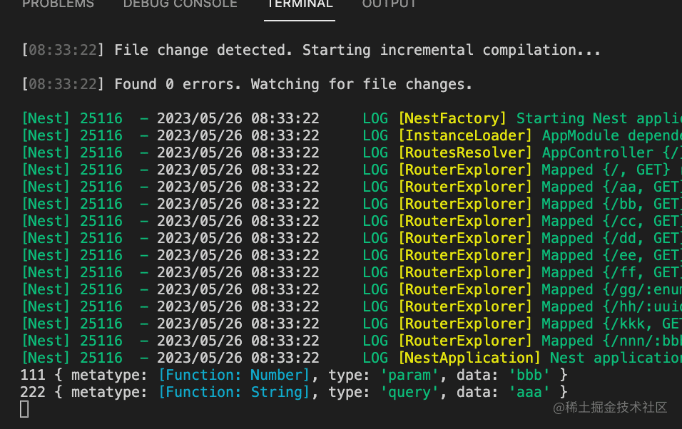 打印的 value 就是 query、param 的值,而 metadata 里包含 type、metatype、data: