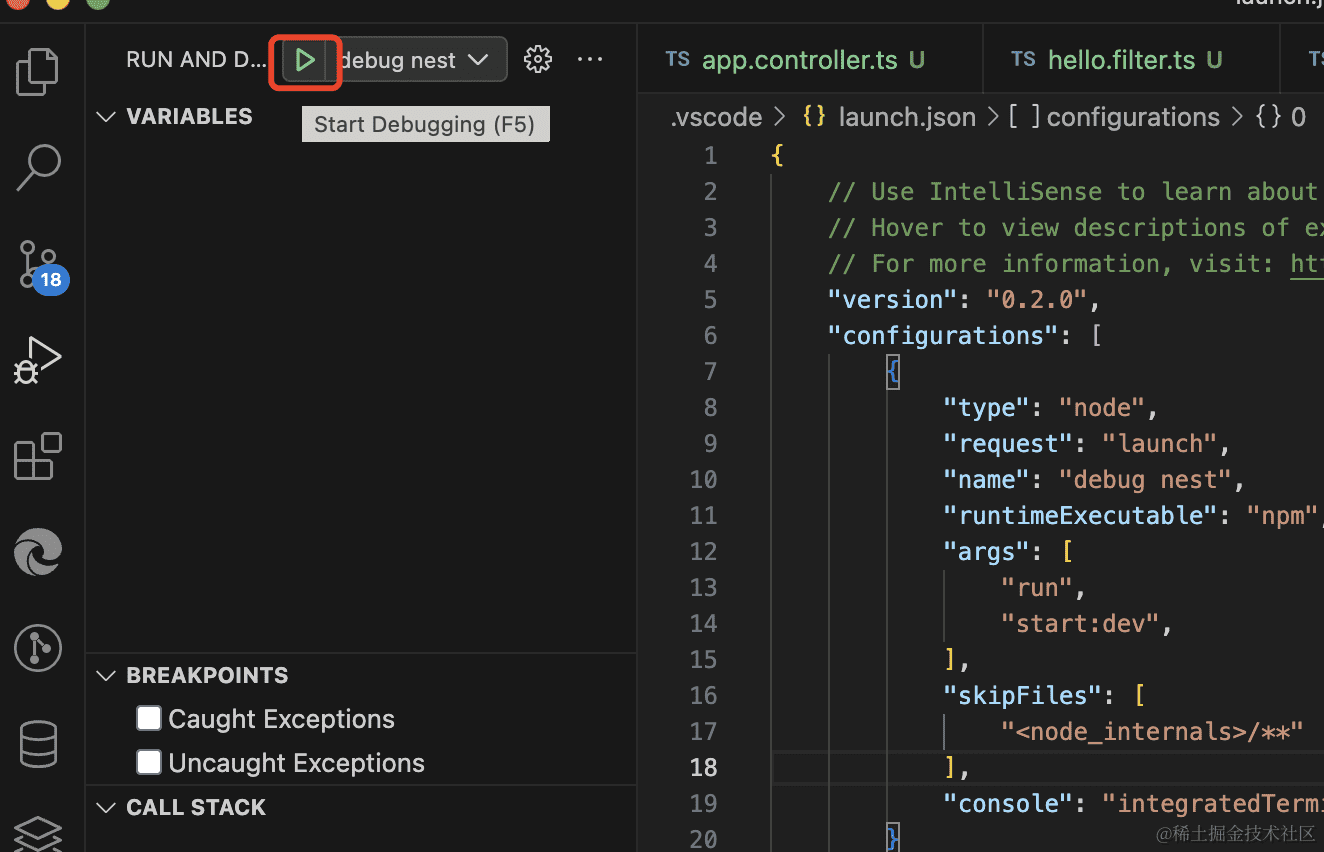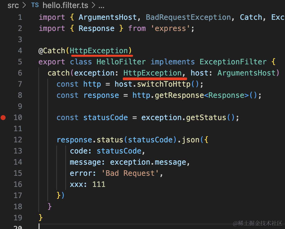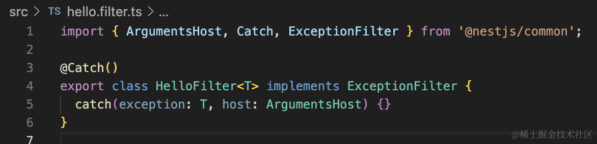 然后我们自己定义个 exception filter:nest g filter hello --flat --no-spec