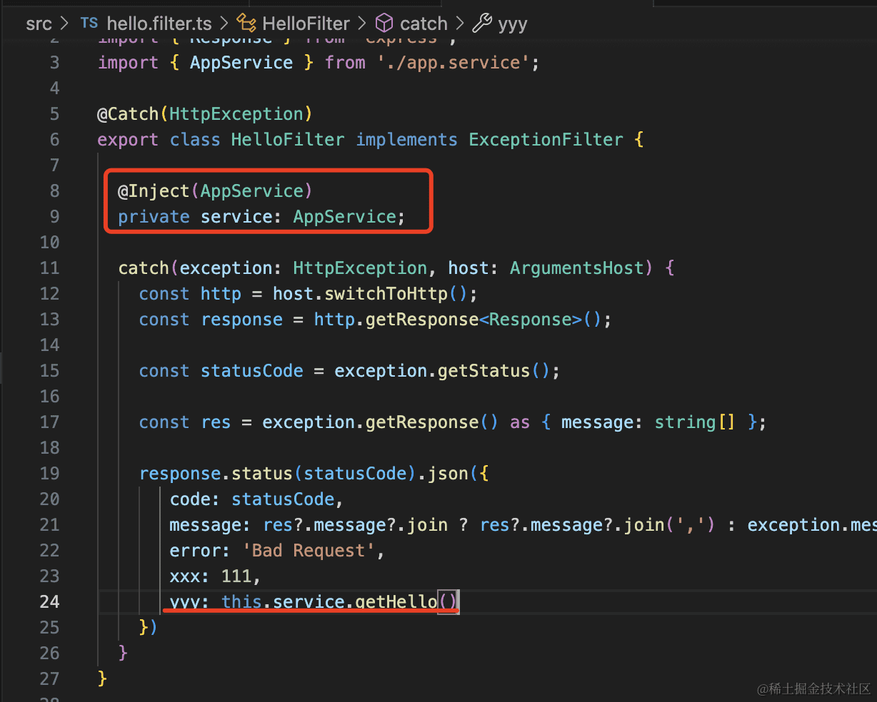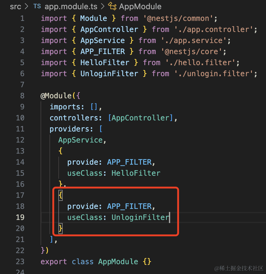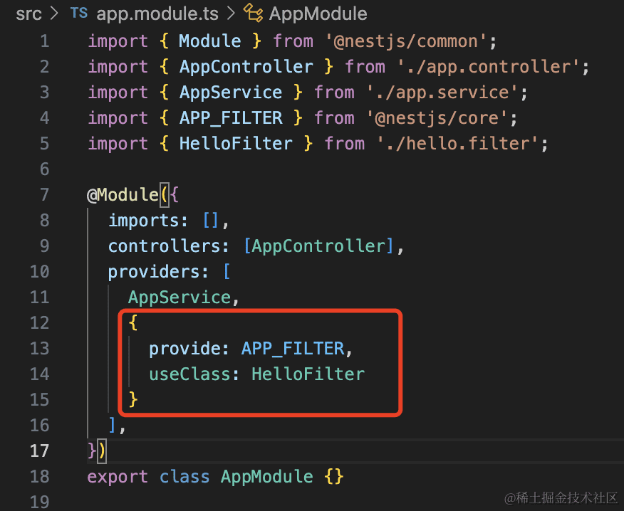 如果 filter 要注入其他 provider,就要通过 AppModule 里注册一个 token 为 APP_FILTER 的 provider 的方式。