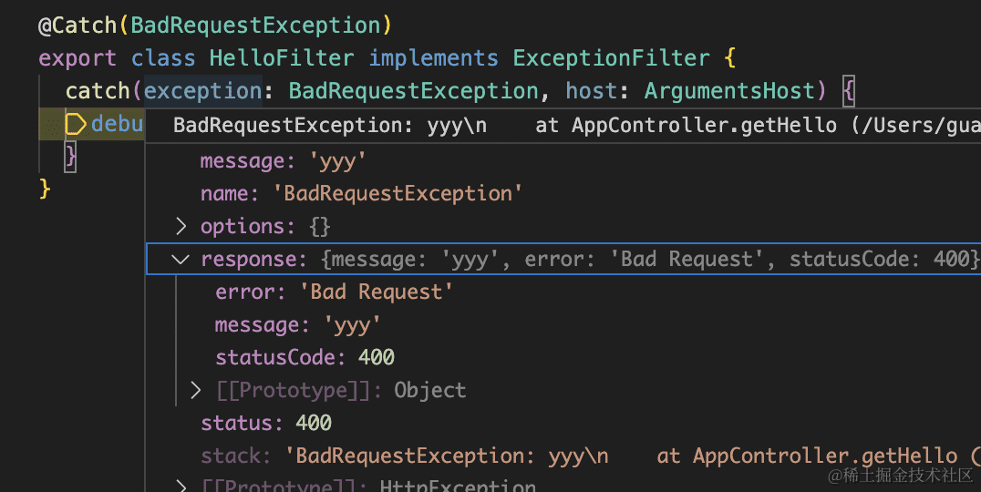 Exception Filter 是在 Nest 应用抛异常的时候,捕获它并返回一个对应的响应。