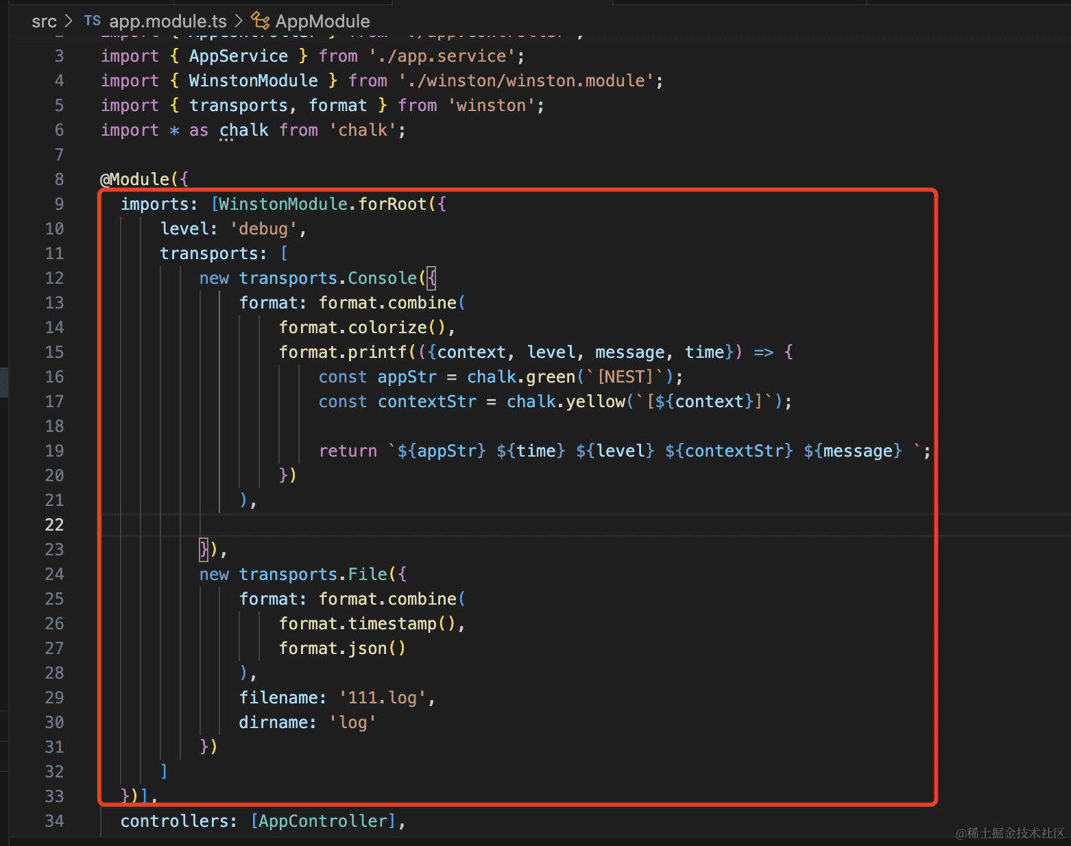 只是想要保持 nest 原本日志的格式,需要用 printf 自定义。我们使用 dayjs + chalk 自定义了 winston 的日志格式。