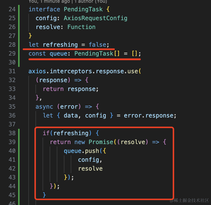 加一个 refreshing 的标记,如果在刷新,那就返回一个 promise,并且把它的 resolve 方法还有 config 加到队列里。