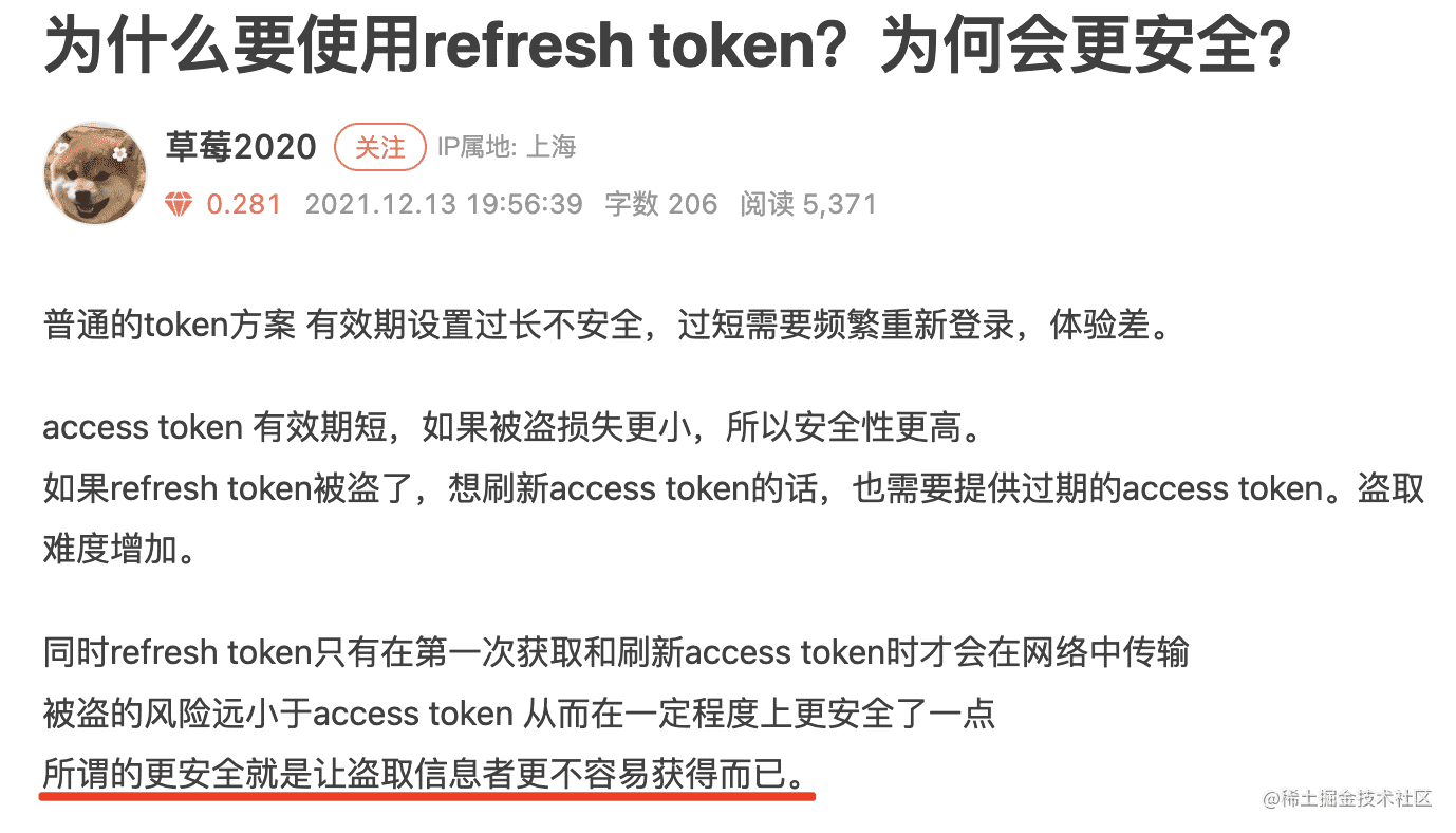 为了解决这个问题,服务端一般会返回两个 token:access_token 和 refresh_token