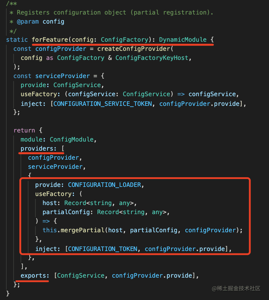 此外,@nestjs/config 还提供了 forFeature 方法来返回动态模块。