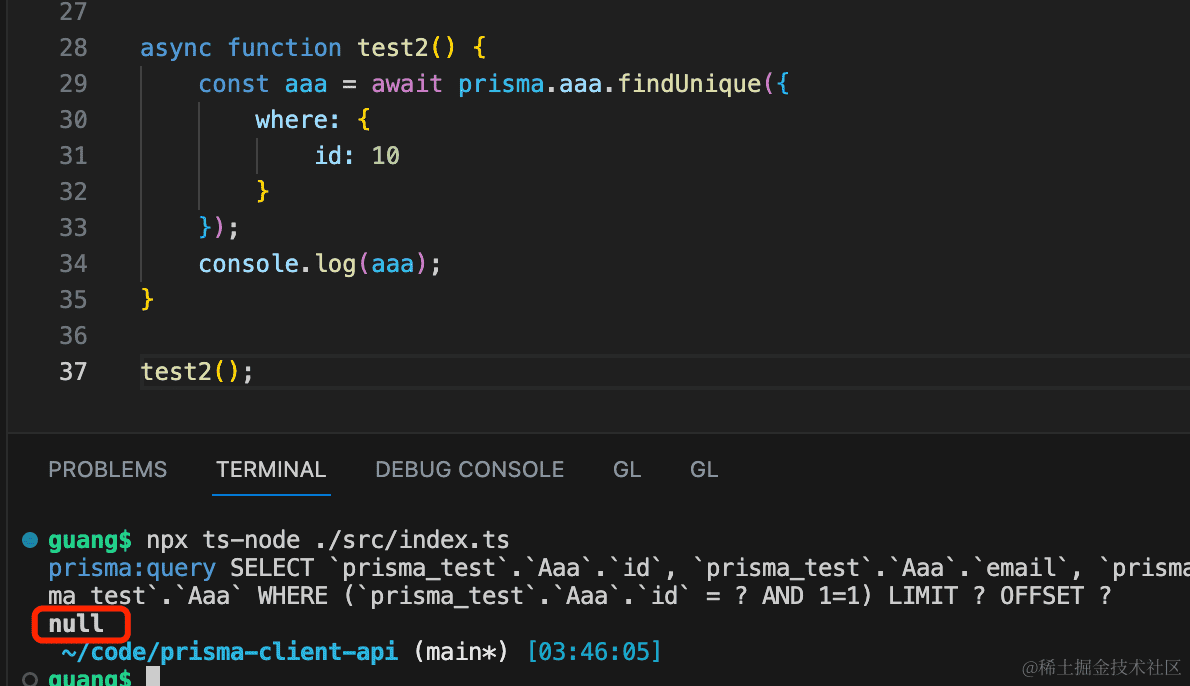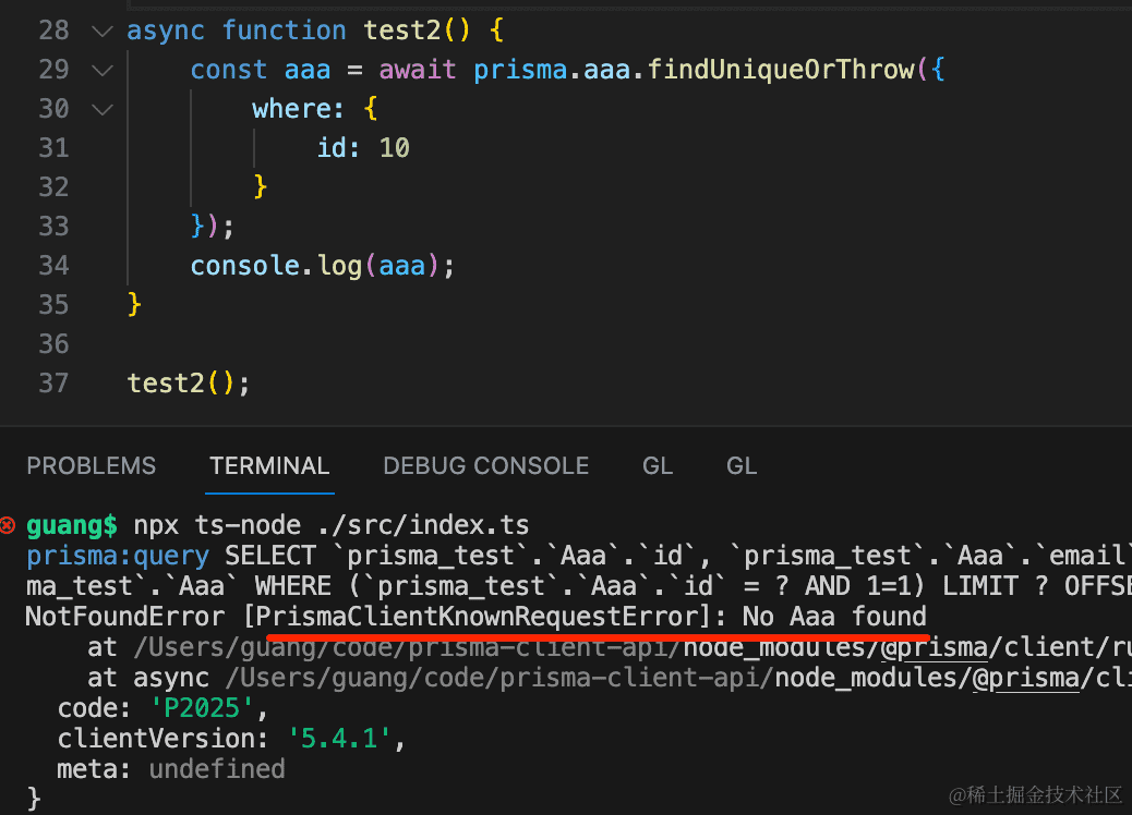 findUniqueOrThrow 和 findUnique 的区别是它如果没找到对应的记录会抛异常,而 findUnique 会返回 null。