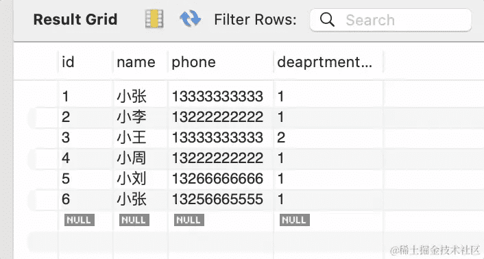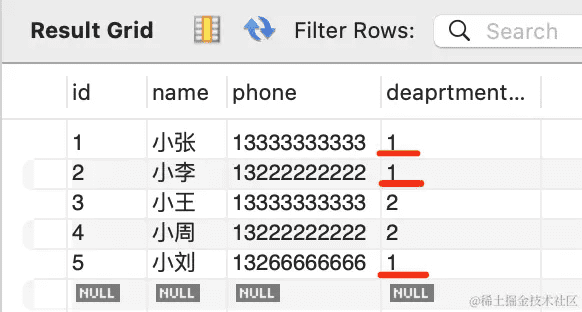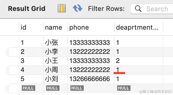 在 mysql workbench 里可以看到,id 为 1 的 department 更新了: